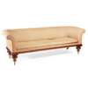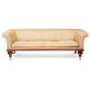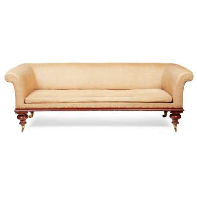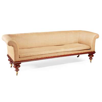 with a low scrolled back and high arms above a loose cushion seat, raised on turned legs with brass caps and castors