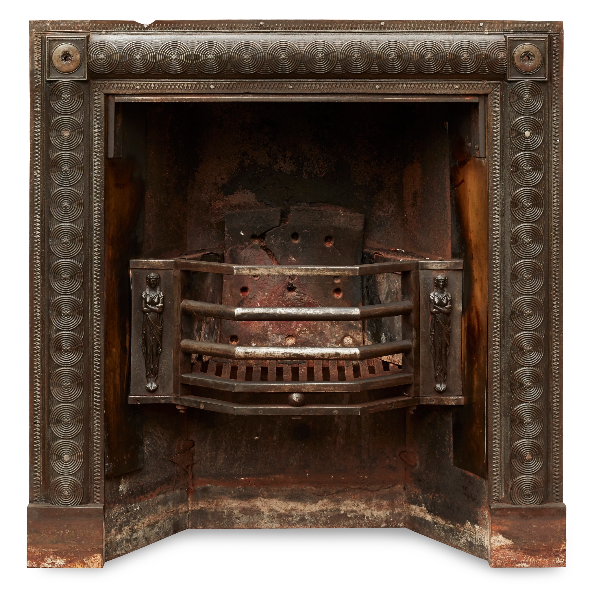 with an angled three bar grate flanked by Eyptian figures, the side panels with bands of concentric roundels