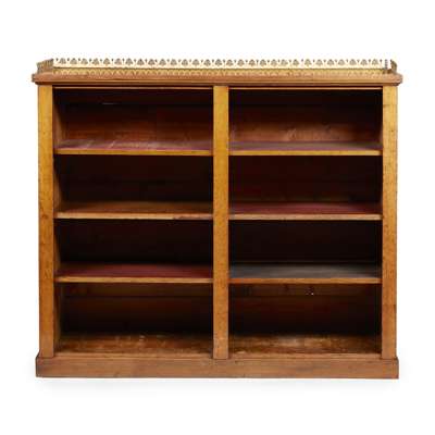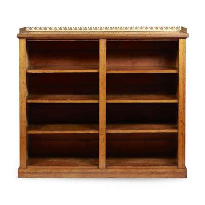 PAIR OF REGENCY OAK BRASS MOUNTED OPEN BOOKCASES