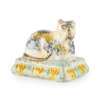 hollow slip cast, modelled crouched with its tail curled along its side, with blue and yellow sponged decoration, the cushion in pale green and yellow glazes