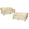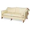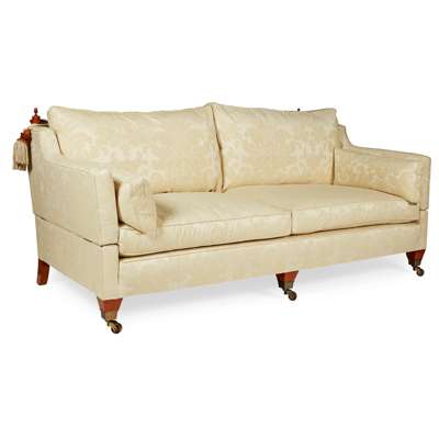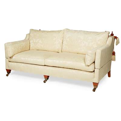 upholstered in cream damask upholstery, with square tapered legs with brass caps and castors