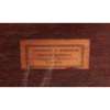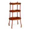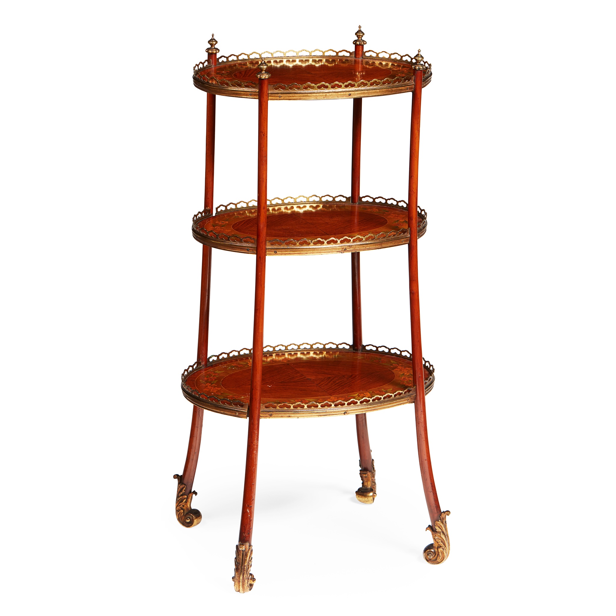 the three tiers each with brass gallery and floral border, on turned supports with brass finials, raised on slightly splayed legs, terminating in scrolled leaf sabots, bearing paper trade label to the underside