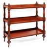 the three tiers with three quarter galleries, raised and divided by square section and baluster turned supports with acorn finials, terminating on bulbous turned legs with brass caps and castors