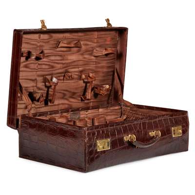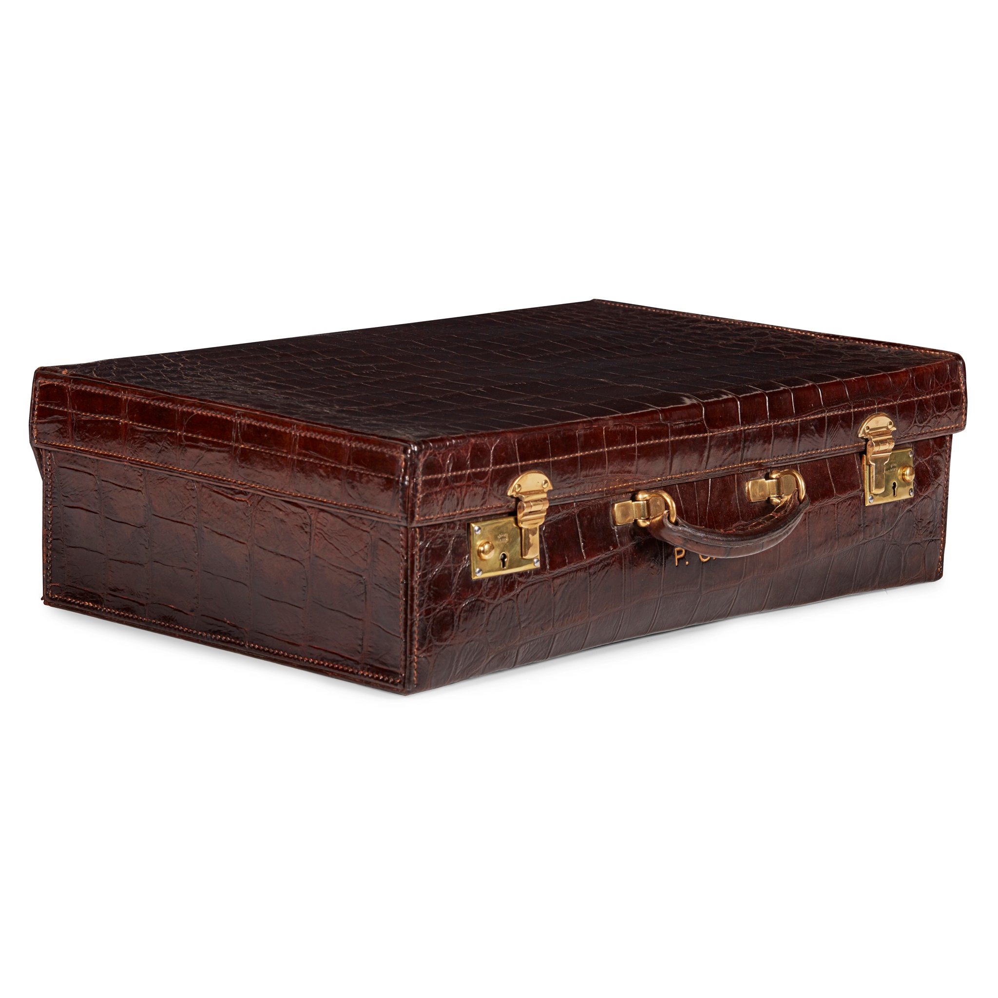 in dark brown stained crocodile skin with brass hardware, embossed monogram P.G.N., the interior with fittings for accessories, now lacking