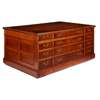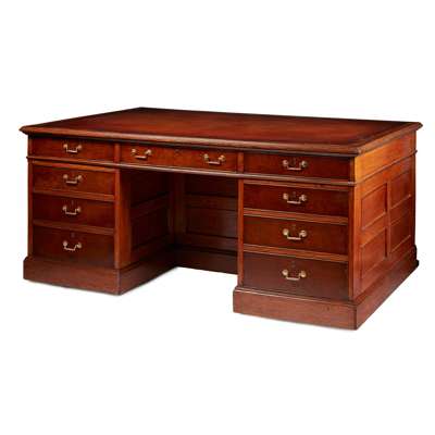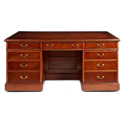 the brown leather top with gilt embossed borders, above an arrangement of twelve short drawers to one side, and nine short drawers around a kneehole recess on the other, on plinth bases with castors