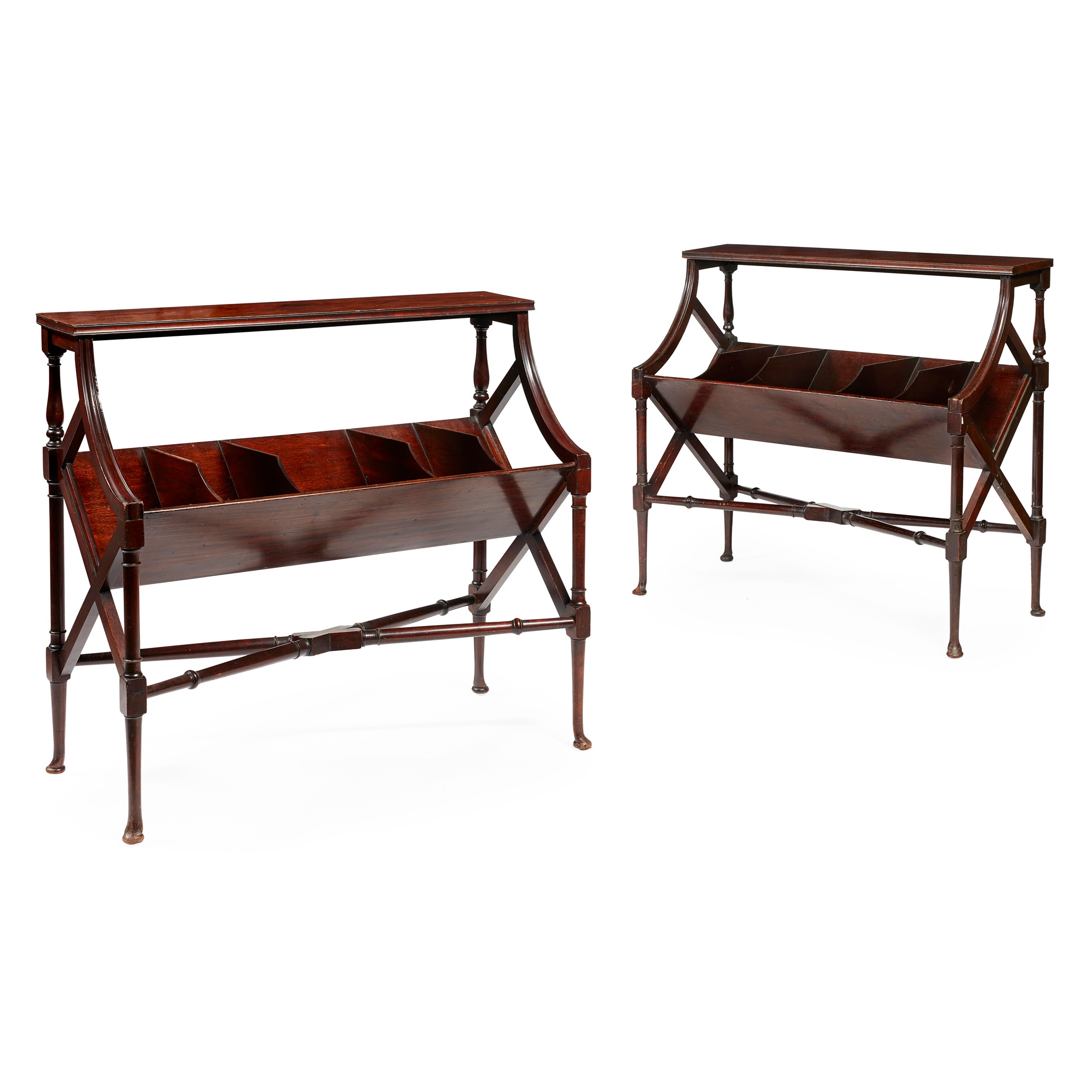 each with a compartmented angled trough raised on turned supports with pad feet and joined by x-stretchers