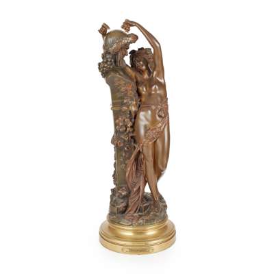 bronze dark brown and medium brown patinas, signed 'A Carriere-Belleuse' with foundry stamp 'B.D. Paris Vrais Bronze'; on an associated circular bronze socle with Salon de Beaux Art plaque