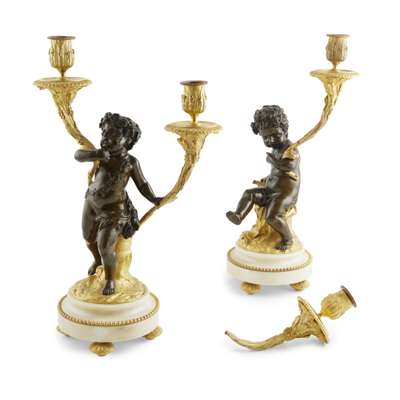 PAIR OF FRENCH GILT AND PATINATED BRONZE AND MARBLE CANDELABRA, AFTER CLODION