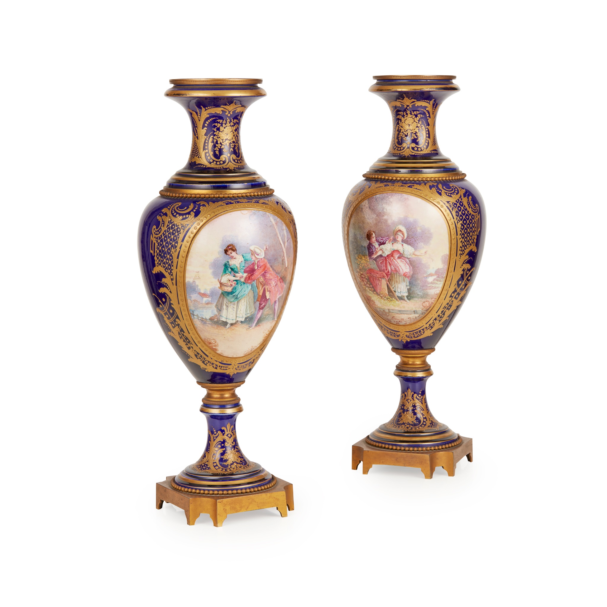 of baluster form, the oval reserves painted with scenes of courting couples and garden landscapes, signed 'Dorival', on cobalt grounds highlighted with gilding, with square gilt metal bases