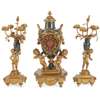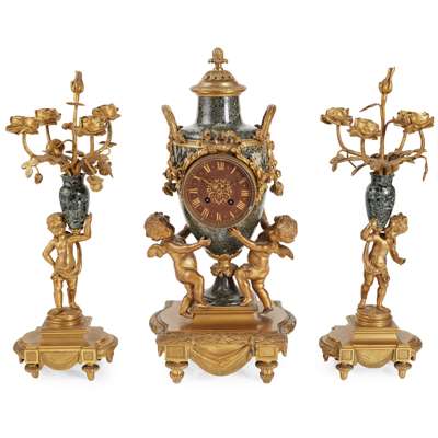LOUIS XVI STYLE GREEN MARBLE AND GILT METAL CLOCK GARNITURE