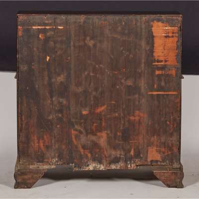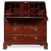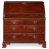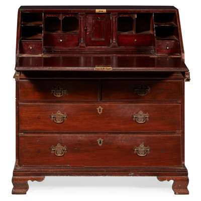 the slant front opening to an interior fitted with pigeon holes, drawers, and a well, above a pair of short and two long graduated drawers, on ogee bracket feet