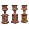 GROUP OF THREE CAST IRON GARDEN URNS AND PLINTHS