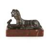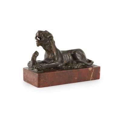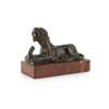 dark brown patina, modelled in a recumbent pose with its mouth open, the hare held between its front paws, on a rouge marble base