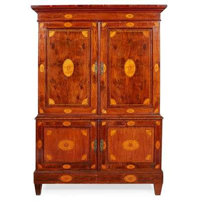 DUTCH YEW, WALNUT, ROSEWOOD, AND FRUITWOOD INLAID PRESS CUPBOARD Y