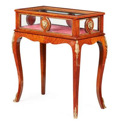 the hinged glazed top opening to a plush lined interior with glazed sides centred by lions' masks, raised on cabriole legs with gilt metal mounts