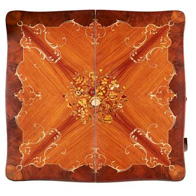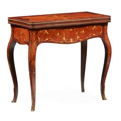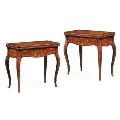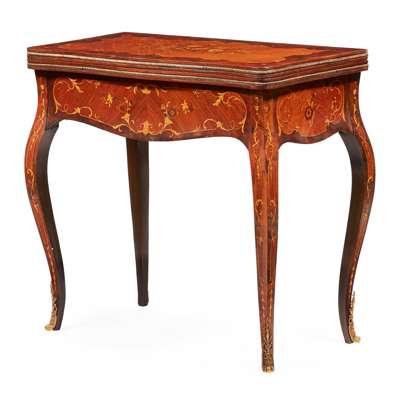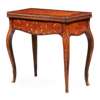 the pivoting fold-over tops outlined with gilt metal and floral and scroll marquetry, raised on cabriole legs with gilt metal mounts