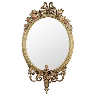 the oval mirror plate in a polychromed frame with ribbon and flower cresting, issuing three scrolled candle arms