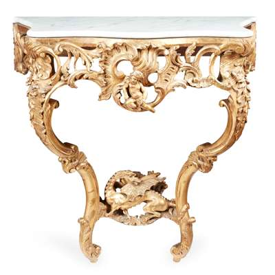 in the Louis XV style, the white veined and shaped marble top above a rocaille and C scroll carved frieze centred by a seated cherub, raised on scroll carved legs united by a crouching dragon