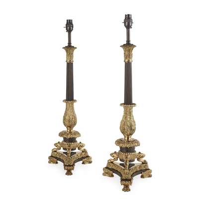 PAIR OF LARGE EMPIRE PATINATED AND GILT BRONZE LAMPS