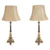 with foliate capitals above reeded columns and acanthus cast bases, on triform monopodia and hairy paw feet, with hexagonal gold silk shades, fitted for electricity
