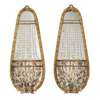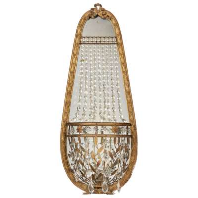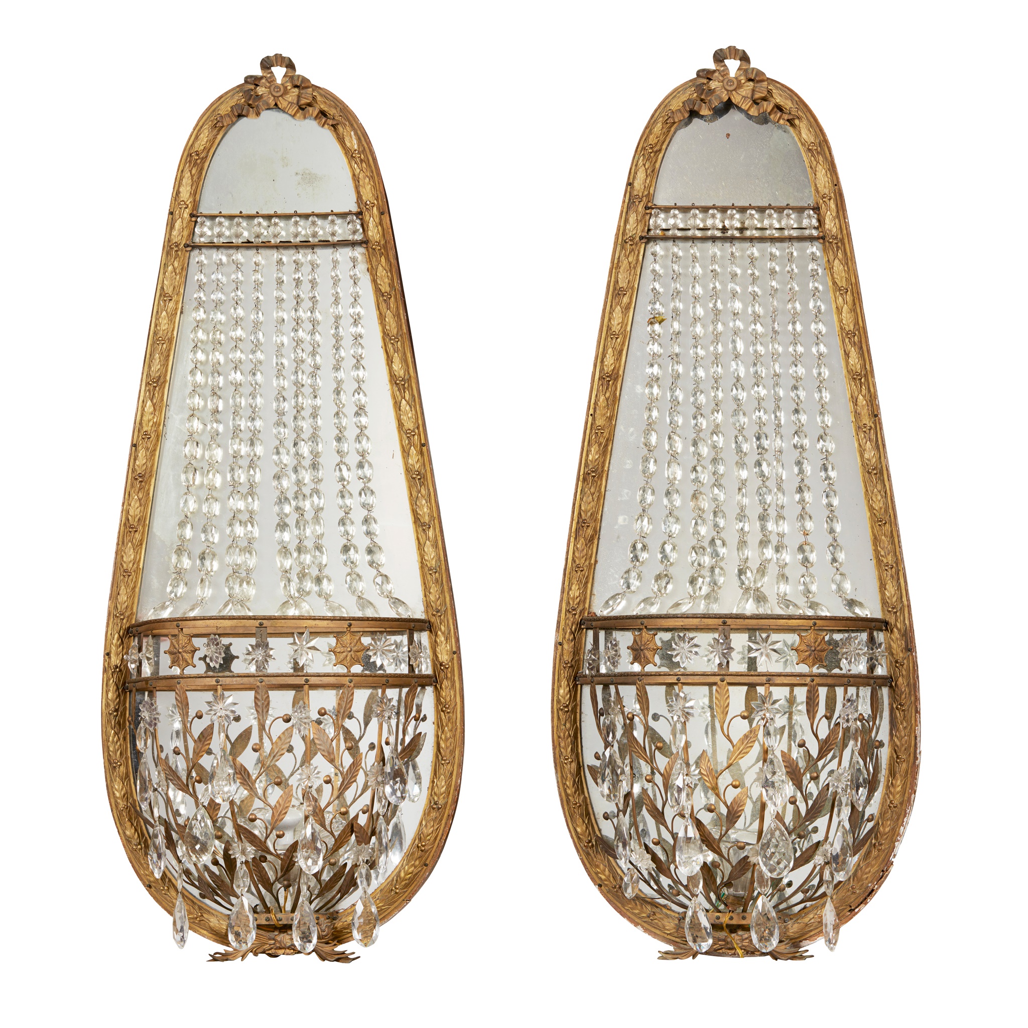 the tapered oval mirror plates in a laurel cast ribbon-tied gilt brass frames, hung with prism swags and drops above open baskets with laurel branches