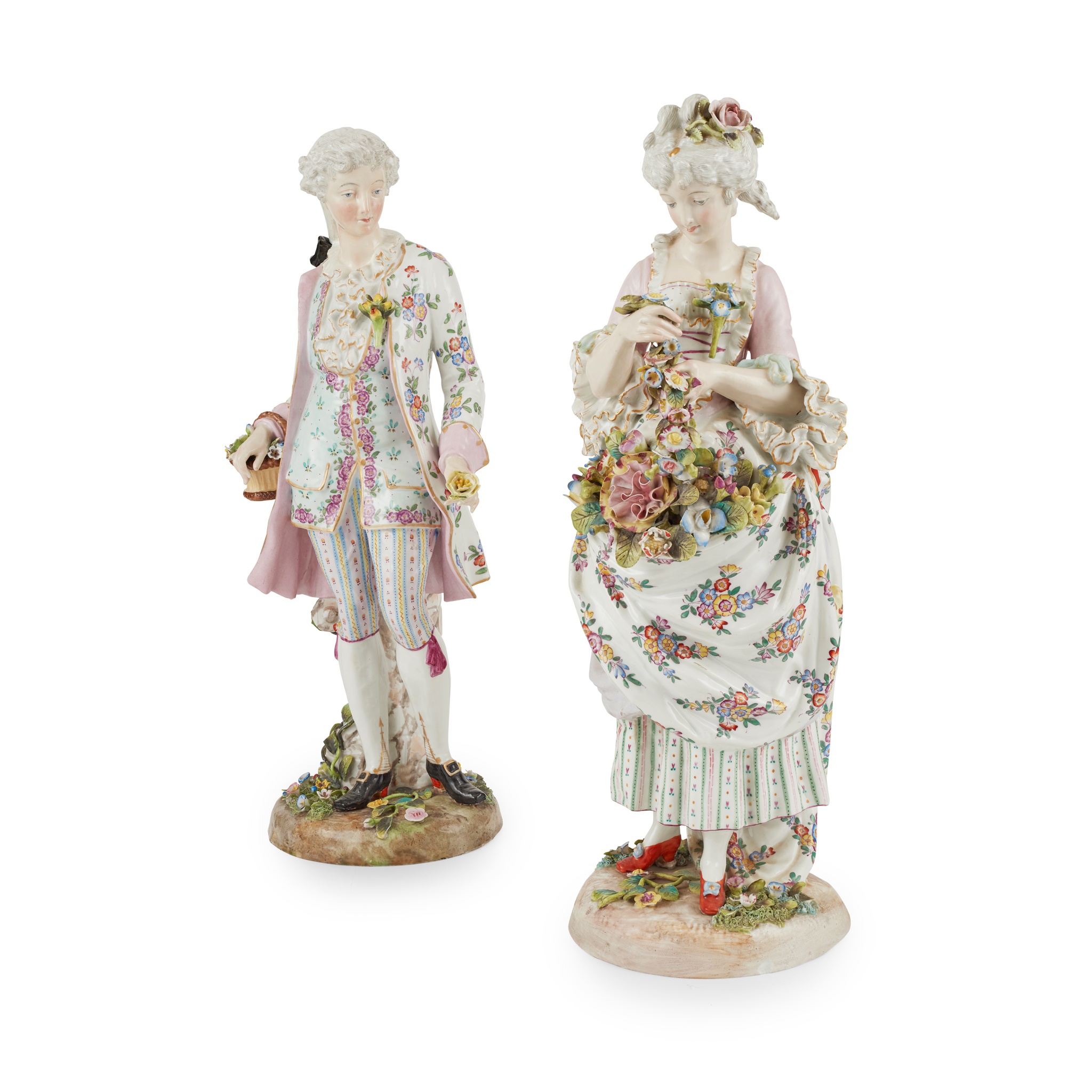 PAIR OF DRESDEN PORCELAIN FIGURES OF A GENTLEMAN AND COMPANION