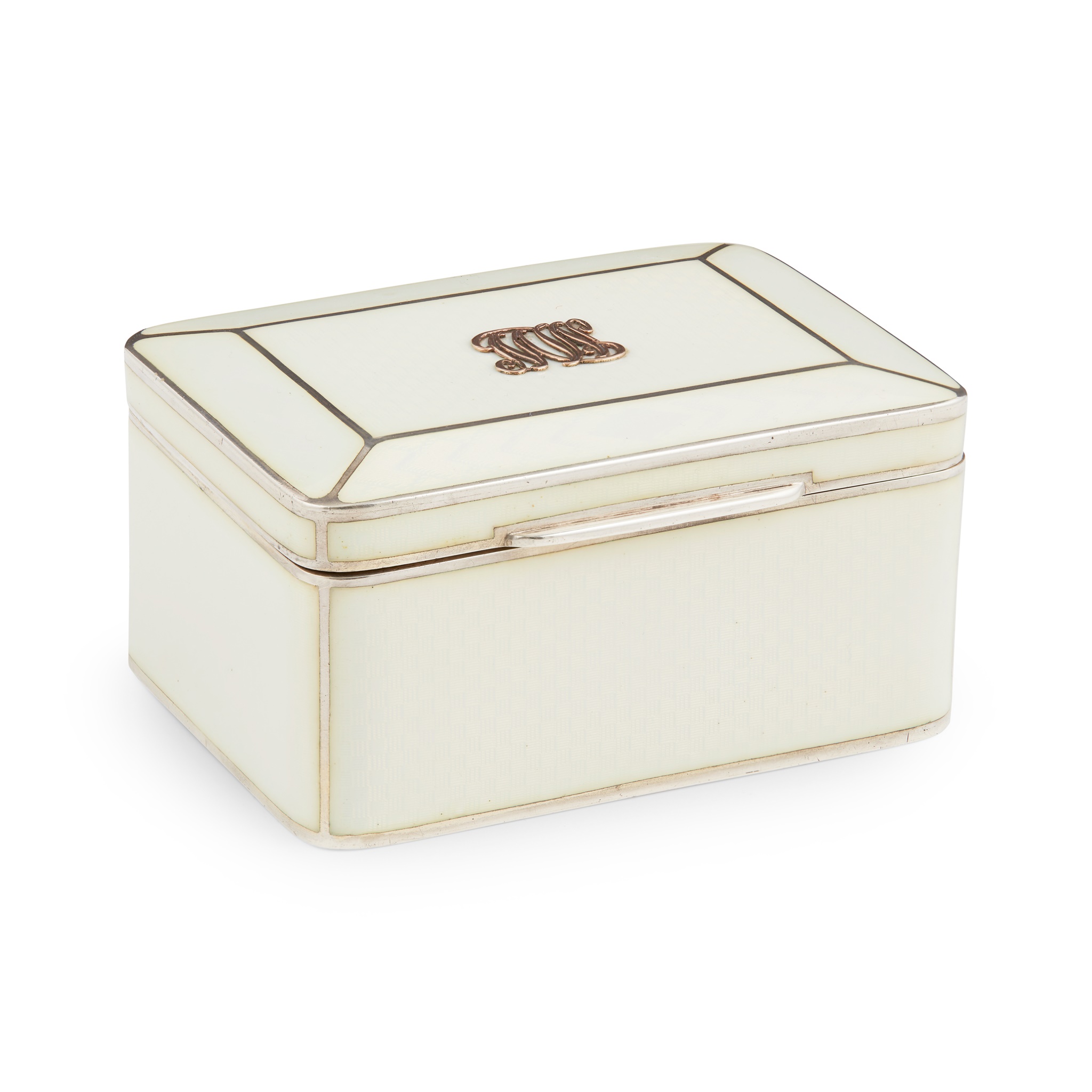 with cream guilloche enamel sides in a silver frame, the hinged top with gold monogram MW, with French export marks and initials BAS.