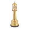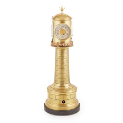 the rotating top with clock, barometer, and two thermometer scales, housed in a brass and copper case in the form of a lighthouse, on a circular black marble base