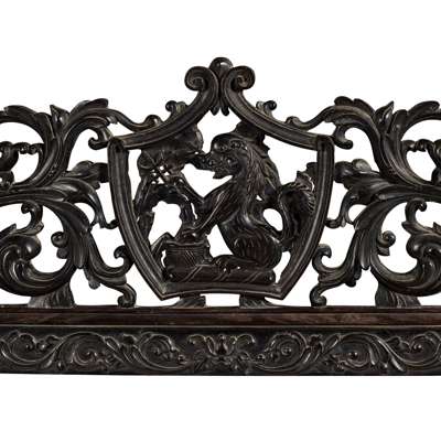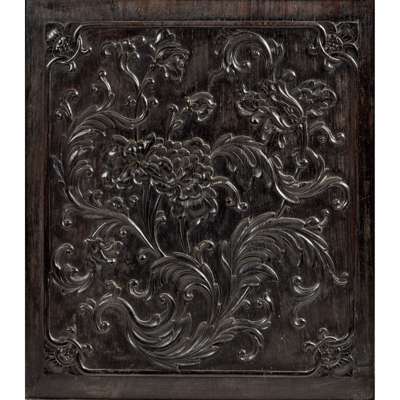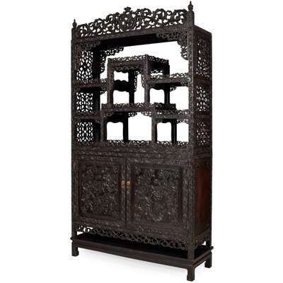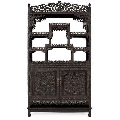 the pierced and carved cornice centred by an armorial lion, above an arrangement of open shelves with pierced and carved galleries and corner brackets, over a pair of cupboard doors carved with chrysanthemums and peonies, on a separate hardwood stand