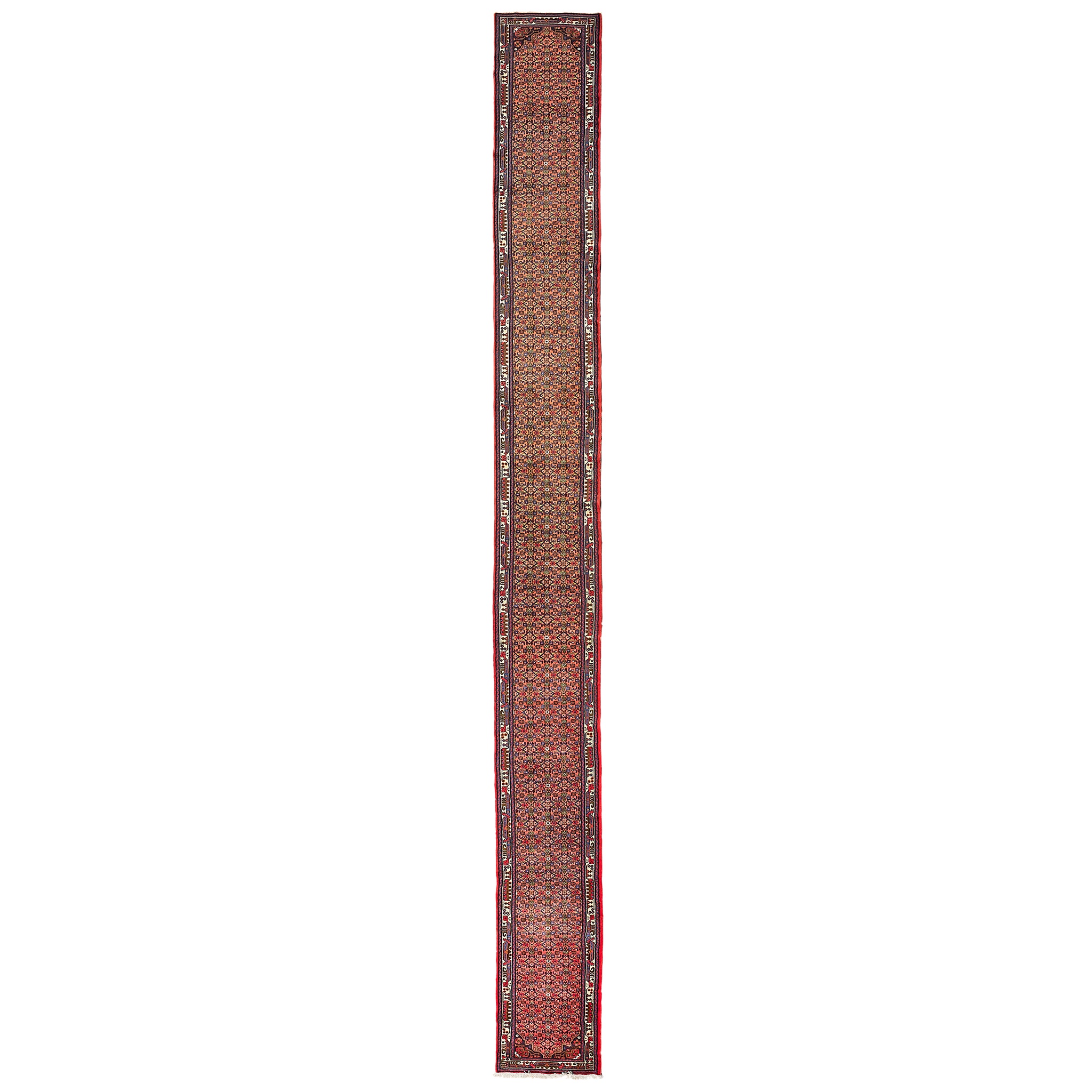 the reddish pink field with allover herati pattern, within narrow stylised ivory border