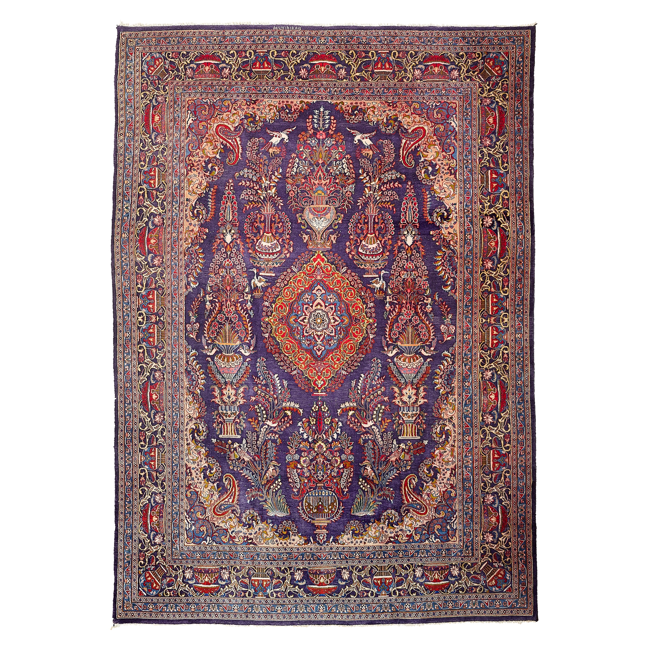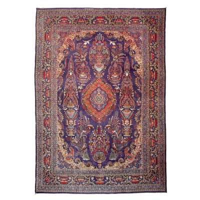 the indigo field with red and blue medallion, surrounded by foliate vases, brown and blue spandrels, within indigo vase and arabesque border