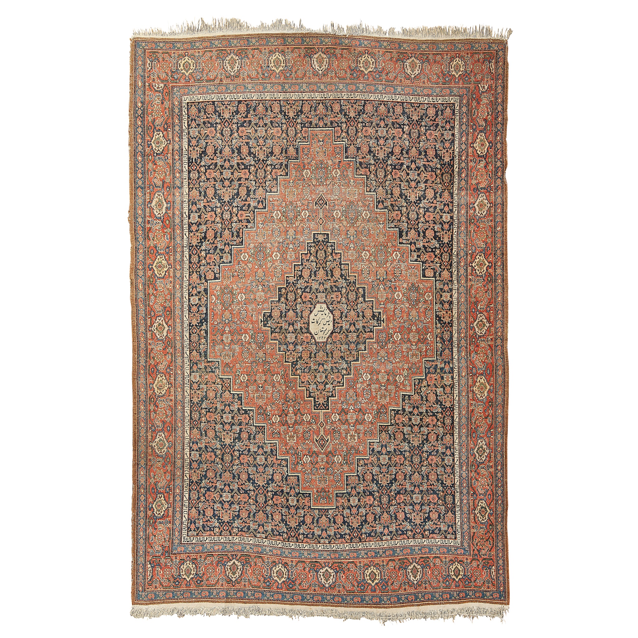 the indigo field with large stepped red and indigo medallion, with ivory script octagon to centre, script band around field, within red turtle palmette border
