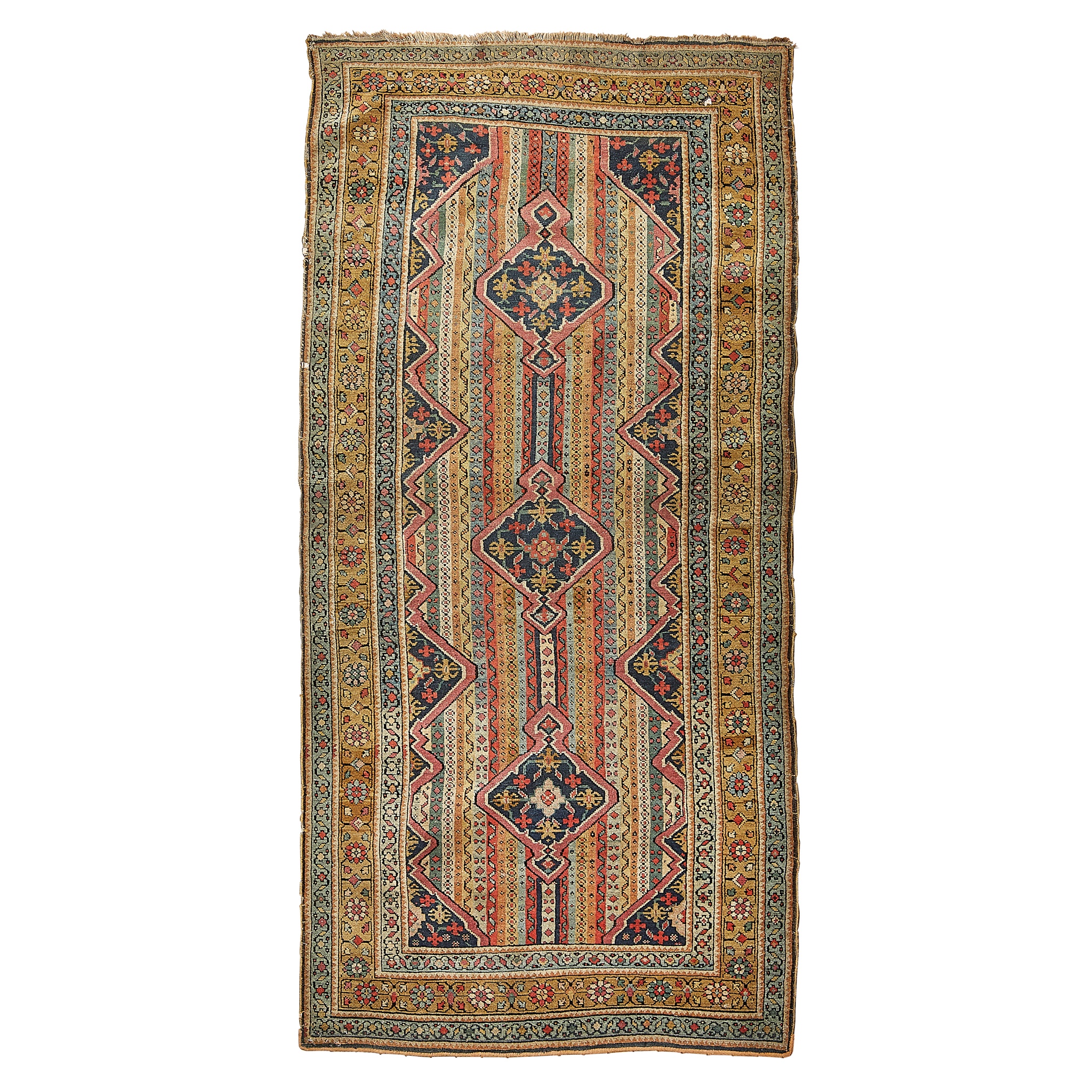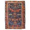 the dated Kuba with indigo field with stylised wing pattern, within red and brown double borders; the other rug with polychrome striped field with three medallions, within camel rosette and vine border