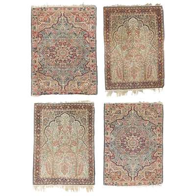 one pair with cream tree-filled mihrab arches, within indigo borders; the other pair with foliate medallions, within foliate borders