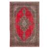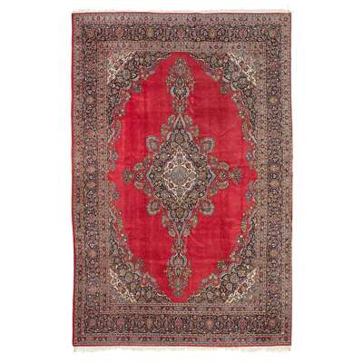the plain burgundy field with elongated indigo and ivory medallion, similar spandrels, within indigo palmette and vine border