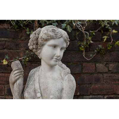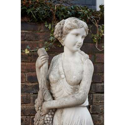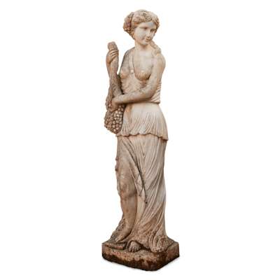 life size, depicting a draped young woman holding bunches of grapes and vines, with a further cluster of grapes in her hair, on a rectangular base, unsigned