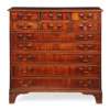 the crossbanded top above an arrangement of six short drawers over five long drawers, on bracket feet