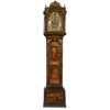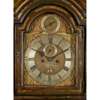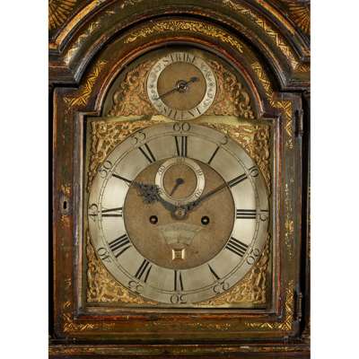 the arched brass dial with a silvered chapter ring marked with Roman and Arabic numbers, with a matted centre with two winding holes, date aperture, subsidiary seconds dial, and Strike/Silent dial to the arch, the name plate signed 'Robt Clidsdale/ Edinburgh', in an arch moulded hood and corner columns, above an arch moulded trunk door with prints of George III and Queen Charlotte, on a plinth base decorated with Chinoiserie; the eight day twin train movement striking a bell