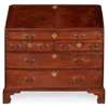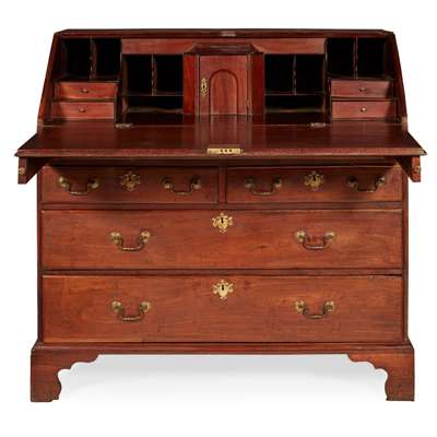 the slant front opening to an arrangement of drawers and pigeon holes, above a long drawer, a pair of short drawers, and two further long drawers, raised on shaped bracket feet