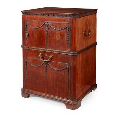 the hinged crossbanded top above a door with carved swags, over a drawer and a further cupboard with carved swags, brass handles to the sides and raised on bracket feet