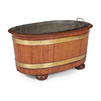 of oval form, staved construction with an everted rim and twin brass bands, raised on bun feet, fitted with a lead lining and tinned copper liner