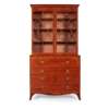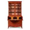 the moulded cornice above a pair of astragal glazed doors opening to adjustable shelves, the lower part with a secretaire drawer fitted with pigeon holes and drawers and a green leather skiver, above three long graduated drawers, raised on French bracket feet