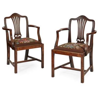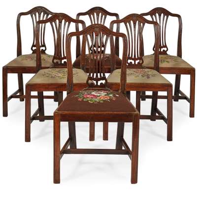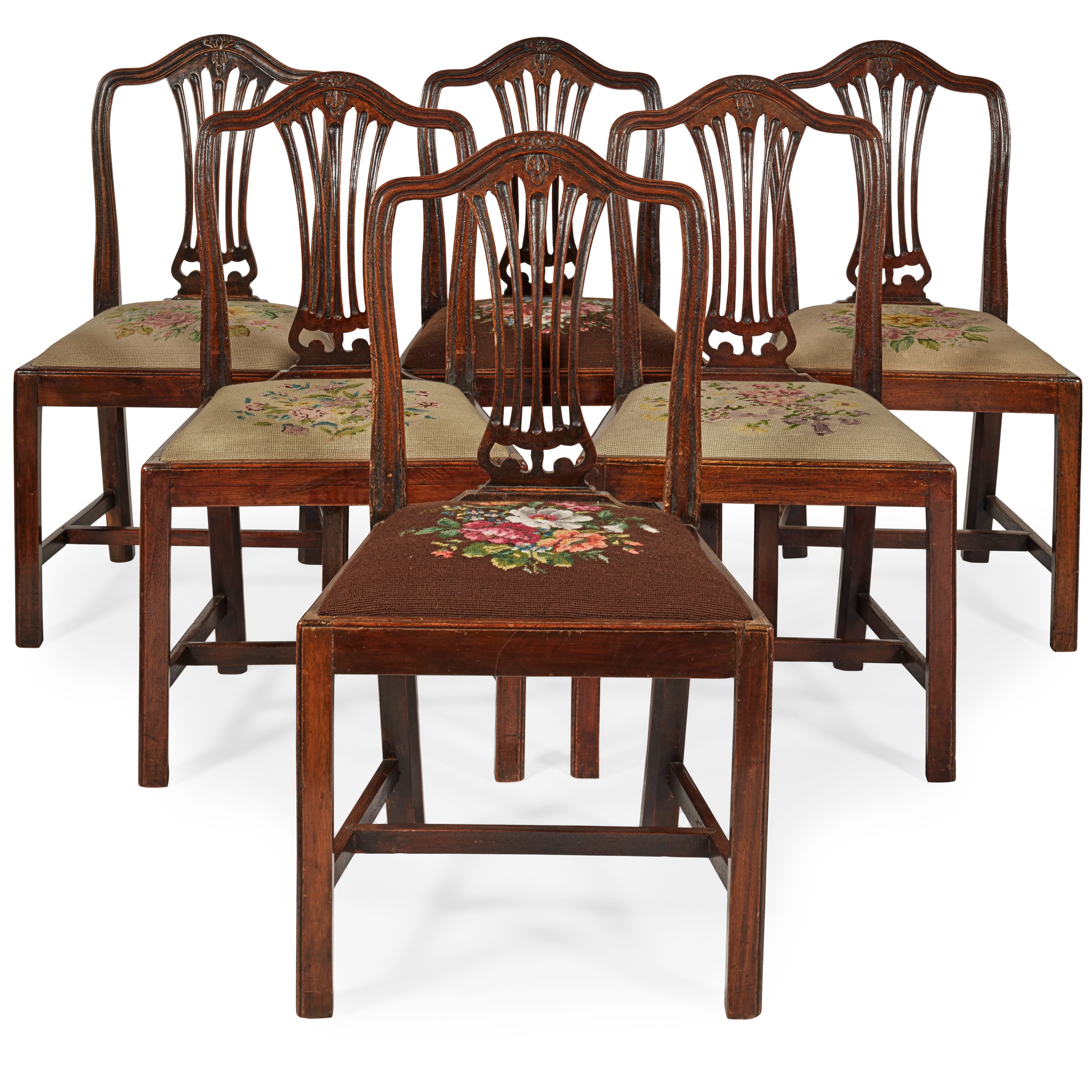 with shaped toprails over pierced vertical splats and needlework drop-in seats, raised on chamferred square legs joined by stretchers; to include six side chairs and a pair of armchairs