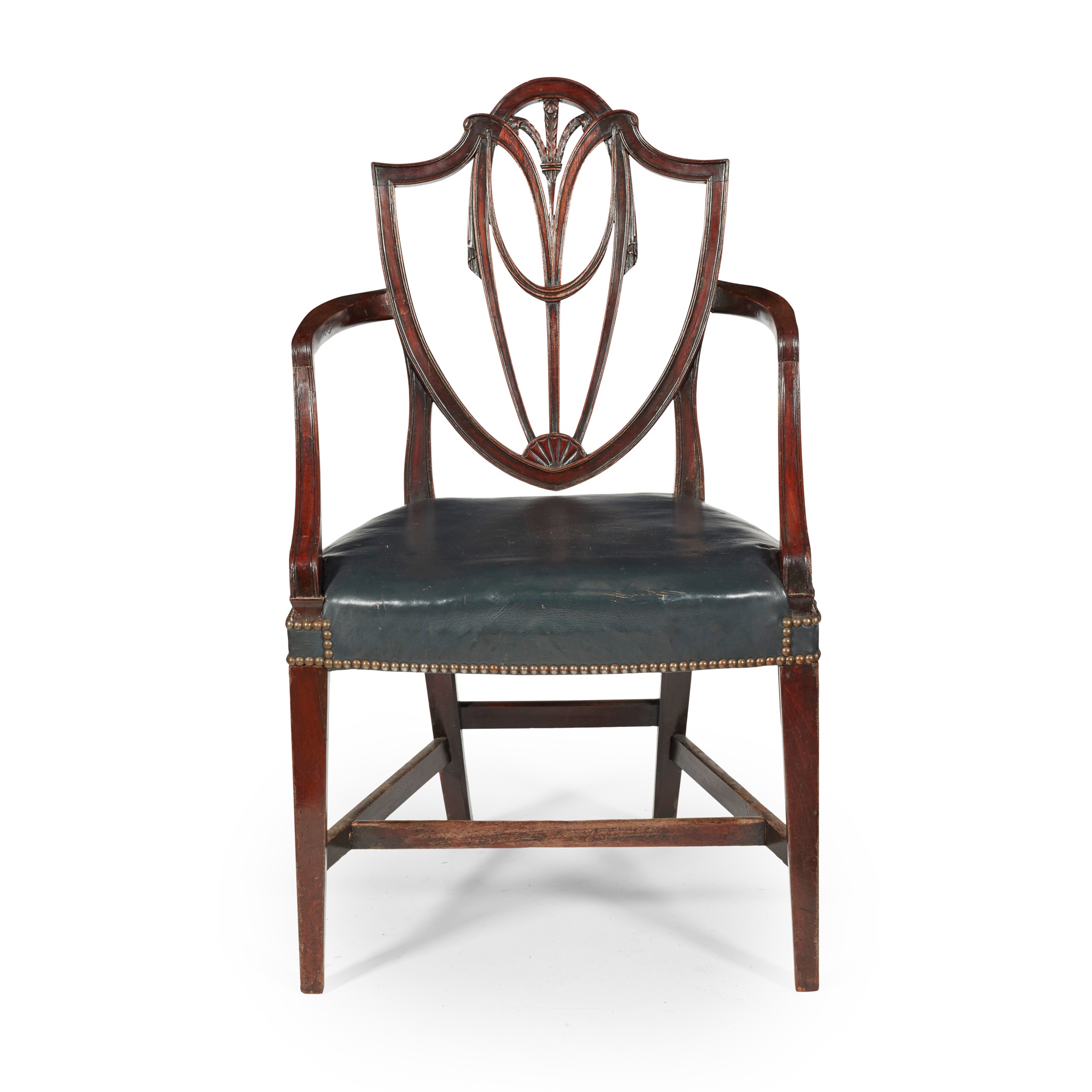in the Hepplewhite style, the shield shaped back carved with swags and Prince-of-Wales plumes, above a blue leather stuffover seat with close nail trim, flanked by open downswept arms and raised on square tapered legs joined by an H stretcher