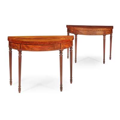 FINE PAIR OF GEORGE III MAHOGANY AND SATINWOOD DEMILUNE CARD TABLES