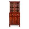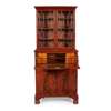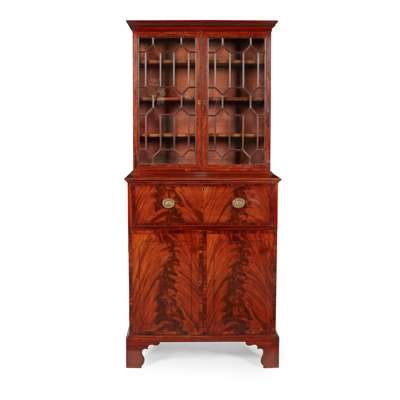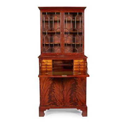 of neat size, the dentil moulded cornice above a pair of astragal glazed doors opening to adjustable shelves, the lower part with a secretaire drawer fitted with pigeon holes, drawers, and a green leather skiver, above a pair of cupboard doors enclosing a slide, raised on shaped bracket feet