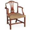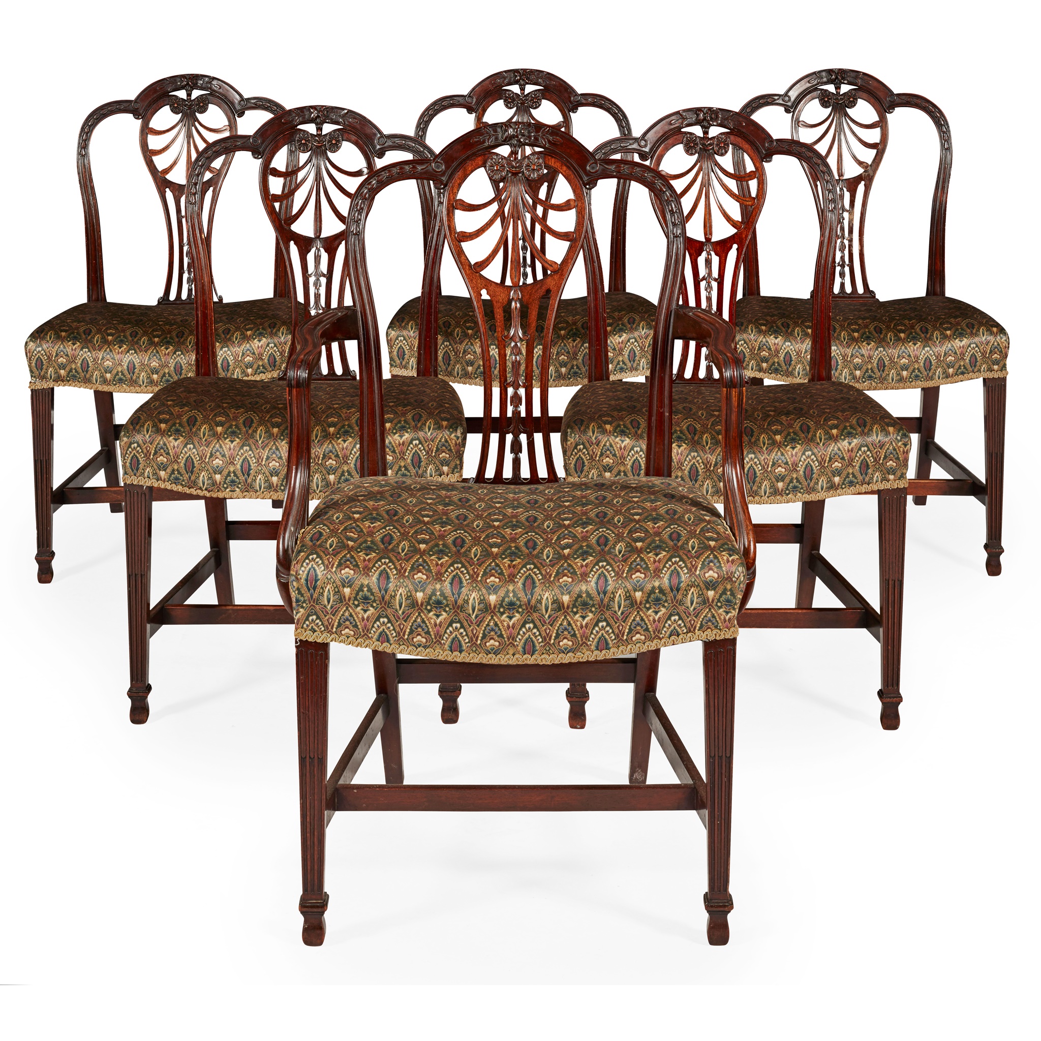 the pierced backs carved with anthemions, bell flowers, and flower heads, above wide curved seats, raised on stop-fluted square tapering legs joined by stretchers, comprising five side chairs and an armchair; together with a GEORGE III MAHOGANY ARMCHAIR, with a pierced splat and channel carved arms, stuff-over seat, and square legs joined by stretchers