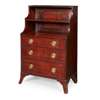 the top with a fixed shelf above three graduated drawers, raised on French bracket feet