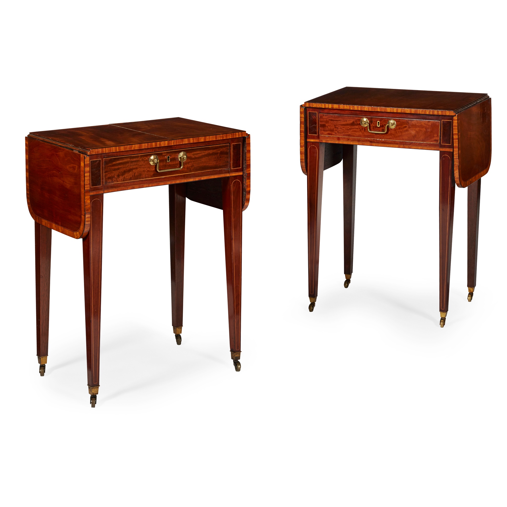 the rounded rectangular crossbanded tops with with drop-leaf sides, over single long frieze drawers, raised on square tapered legs outlined with stringing and ending on brass caps and castors