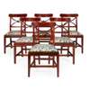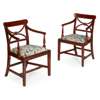 comprising a pair of armchairs and six side chairs, the bar backs above X-form rails and drop-in seats in blue and cream foliate fabric, raised on square tapered legs joined by H-stretchers